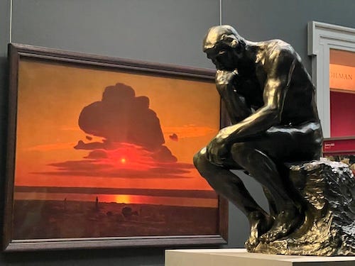 But it wasn’t too long before life provided the missing piece. While visiting the Metropolitan Museum of Art in New York City, I wandered through Gallery 800, which features late 19th and early 20th century European art. There I came upon a bronze casting of Rodin’s famous sculpture “The Thinker.” I was struck once again by the massive figure, both grounded and emotive. The man does not hold his hand to his cheek like my grandmother did, but leans his chin on his knuckles. Behind the sculpture is an extraordinary painting of a luminescent sunset, aflame in color with a dramatic cloudscape that was almost surreal. The juxtaposition of the dark figure with the painting was dramatic.