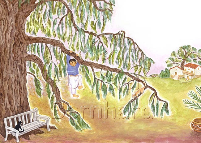 In this illustration, a little boy has shimmied up the trunk and swings like a monkey from the massive, living playground. The two cats are based on my son’s cats, who lived with him at the time when he was in grad school. I like hiding little details from my life and those of my family in my illustrations.