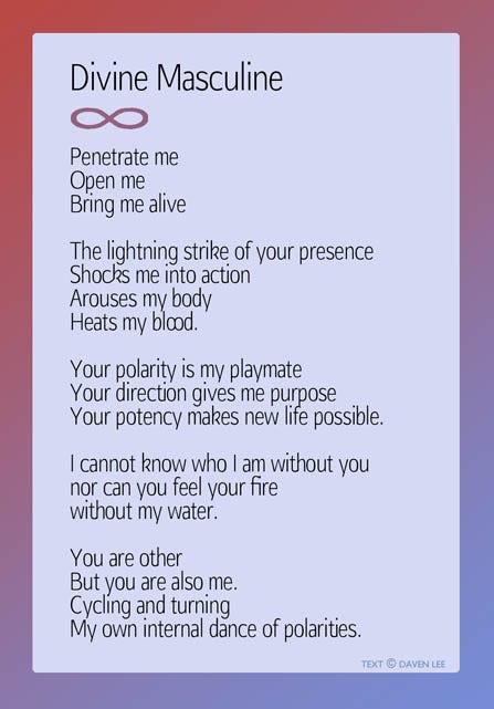I’ve been gifted with amazing masculine energies in my life, in both human and divine form. I thrive on these polarities as an artist, a dancer, a drummer, and in personal relationships – and I count my lucky stars that we are free, in this society, to explore these dualities within ourselves and others. When the polar energies of feminine and masculine come together in harmonious union, life is sweet.
