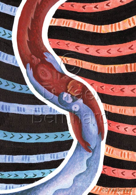 The concept of the Night-Sea Journey comes from ancient myths, formalized by ethnologist Leo Frobenius and later Carl Jung, symbolizing the hero's descent into the dark and transformative sea of the unconscious, mirroring the sun's nightly passage beneath the world. This theme is also seen in myths like Jonah and the Whale, Osiris, or Inanna. Some forty years ago I was captivated by it, and created this image of a man and a woman on their night-sea journey together, entwined in the energies of the unconscious as they hold each other in a dream state.