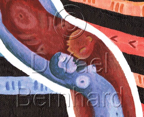 As the illustrator, I could have depicted this polarity in any number of ways. I love images of male-female interaction – an inexhaustible subject for artists. But when I read the text, a prior image came to mind – a hand-colored linoleum block print I had created years earlier titled The Night-Sea Journey: