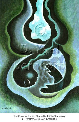 This image illustrates the “Grief” card in The Power of the Yin oracle deck, published in 2022. The deck contains over fifty original images that I painted in collaboration with Daven Lee, the author of the deck. Her brainchild has many influences, including her background as a teacher of QiGong, a couples therapist, a craniosacral healer, and a practitioner of Tantric principles of sexual energy. Daven was drawn to the many influences in my work as well. We hit it off right away.