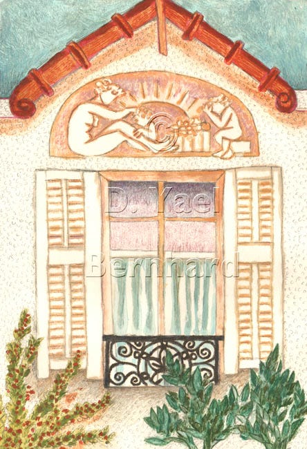 This followed my first trip to Europe, where I had planned to study art at the Academy Julian in Paris. I never enrolled there (one of my greatest regrets), but I did visit nearly all the museums in Paris, and then traveled to the south and spent a few weeks in Nice. The French are the great preservers of history, and I was enthralled by the architecture, so grand and ornate, along the seaside Promenade des Anglais! I was particularly intrigued by windows and doors, and did a number of studies of places I passed on foot. This house, with its stone relief carving over the window, was one example.