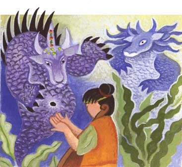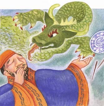 Chinese folklore abounds with dragons – those strange, mythical creatures that seem like a cross between a lizard and horse. I don’t recall how this well-intended brother ends up with these underwater dragons, but evidently he must return the stone to its rightful owners. That he does, and is rewarded in the end with the granting of a wish, which lifts his elderly parents and grandparents out of poverty. The confluence of chance with righteous choices and deeds makes for a happy ending.