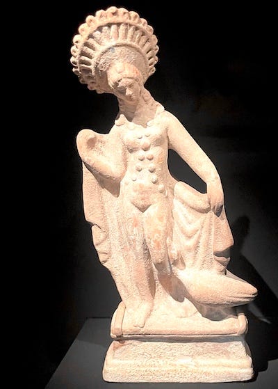 At first I thought she was Venus – but no, she is Aphrodite, the Greek goddess of love and beauty, carved in the 1st century CE. She is accompanied by a goose, symbolizing her ability to fly to other realms, and to display both affection and watchfulness (geese make amazing watchdogs). Many times I’ve gazed at this photo, wishing to internalize the elegant little goddess, that she might re-emerge in my art. Once I soak up an image, I wait for the right opportunity to bring it into my art. It must be the right subject and technique – a confluence of content and form. This usually takes a few months, but it can be longer or shorter.
