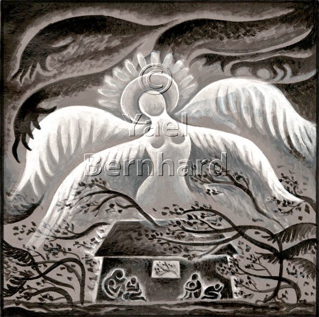 Watching the news through the hurricane, I tried to imagine the homes of my friends and all their loved ones surrounded in white light. This crystallized into this tonal sketch. I used black and white acrylic paint on grey paper – a technique that allows me to paint both darker and lighter than the middle tone. The grey paper seemed like the perfect background for the dark turbulence in the sky, and for the angel to shine in contrast.