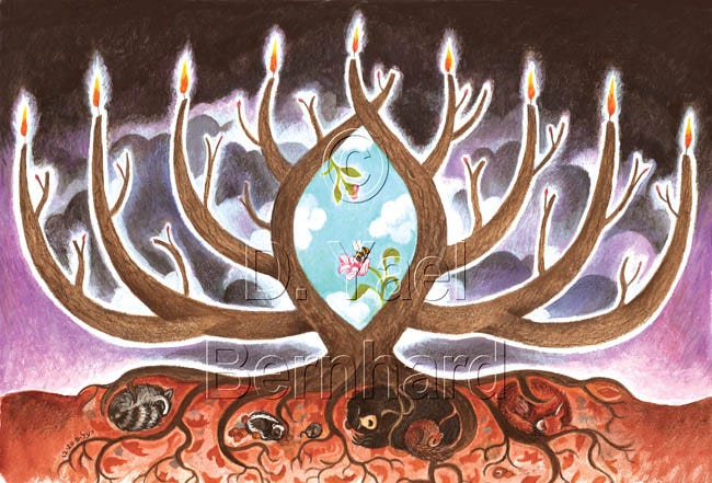 Chanukah begins at sundown tomorrow night, and this year, ends on Winter Solstice. The holiday commemorates freedom from the oppressive rule of the Seleucid Greek empire in ancient Israel, in the 2nd century BCE. It’s not directly tied to the seasons (except that it’s associated with the olive harvest and the pressing of new olive oil). But in the sense of turning from oppression to freedom and therefore from darkness to light, I also see a connection to Solstice. Nature isn’t a power-hungry tyrant like the ancient King Antiochus was, but winter can be very harsh, and is indeed a challenging time. Here in the Diaspora, deciduous trees are symbols of renewal, as they go through a sort of death and rebirth each year. The animals sleep patiently under the earth, awaiting the promise held out by the tree that new life and abundance will return in the spring.
